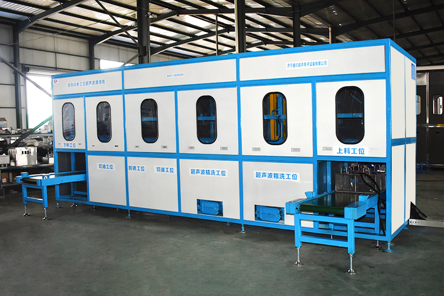 該設(shè)備有自動上下料及轉(zhuǎn)角系統(tǒng)、超聲波清洗系統(tǒng),自動拋動、自動溢流和油污分離裝置,噴淋系統(tǒng)、自動高壓切水系統(tǒng)、自動烘干系統(tǒng)。機(jī)械手自動輸送系統(tǒng)采用高精度直線導(dǎo)軌配合高精度位置檢測傳感器,機(jī)械手可以準(zhǔn)確的實現(xiàn)工件的抓取和放置。自動進(jìn)排液和自動加溫系統(tǒng)完全實現(xiàn)了無人干預(yù),自動運行,很大程度上降低了工人的勞動強(qiáng)度。先進(jìn)的霧氣處理系統(tǒng)可以將清洗時產(chǎn)生的霧氣冷凝回流,空氣經(jīng)過濾和活性炭吸附后排出。