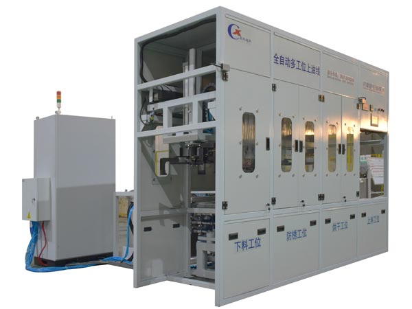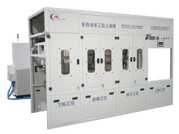 該設(shè)備為自動(dòng)防銹烘干機(jī),采用高壓熱風(fēng)循環(huán)干燥+霧化噴淋工藝,整機(jī)采用多臂機(jī)械手傳動(dòng)機(jī)構(gòu),PLC+ 觸摸屏控制。該設(shè)備共4個(gè)工位:上料工位、高壓熱風(fēng)烘干工位、霧 化噴淋防銹工位、下料 工位。該設(shè)備還包含循環(huán)過(guò)濾裝置等。該機(jī)結(jié)構(gòu)設(shè)計(jì)及工藝安排合理、自動(dòng)化程度高、上油精度高, 有效解決了此類工件的上油難題.